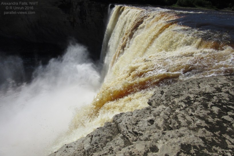Part of the Northwest Territories’ Twin Falls Territorial Park, Alexandra Falls is on the Hay River. A short hike leads downriver to the second falls, Louise Falls(and the third waterfall at the park, Escarpment Creek Falls is past Loise Falls roughly to the north, near the highway). The trail between Alexandra Falls and Louise Falls is along the top of the cliff to the left: