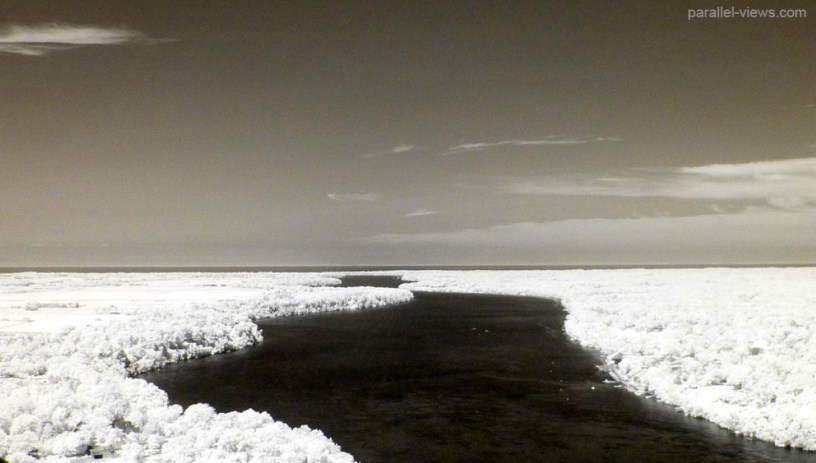 And here is the view using my 760 nm filter. There is a grating across the openings; my visible spectrum camera’s lens would fit through the grating, but not my dull spectrum camera. As a result, there is a small bar obscuring part of the foreground.