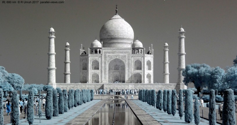 There are a lot of similarities to a full UV photo- the sky is extremely light, and the foliage is extremely dark, almost black. Unlike a UV photo, there is still a lot of colour in the picture. There is a pinkish hue through most of the photo, contrasting with the dark green of the trees. Some people seem to be wearing blue, but that is more an effect of the colour change. The Taj Mahal is still the brightest object in the photo, or at least the side facing the sun is. The sandstone looks like it has a similar hue to the marble; the marble is still lighter, but not by much. I don’t know why this photo had a white balance that Photoshop could work with- no other short pass photo could be converted the same way(and I tried with dozens of them). Perhaps the marble?