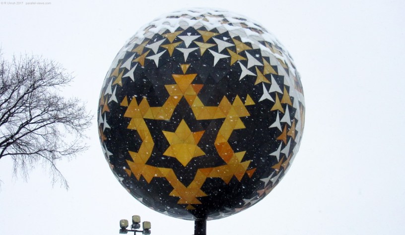 The egg was commissioned in 1973 to celebrate the centennial of the founding of the RCMP. The Pysanka was designed by Ron Resch, a computer science professor- the computer modelling of the egg was a complex task. The design is composed of thousands of interlocking pieces, machine cut into the precise shape. The egg pivots on the stand, acting as a weathervane.