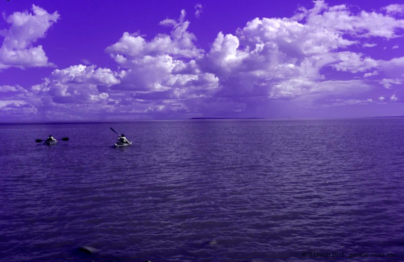 With my Ultraviolet/Infrared dual band filter(a Schott UG11 Filter), the photo is dominated by a dark indigo colour. As well, this filter makes kayakers visible to the naked eye… well, either that, or they paddled into the photo while I changed filters.