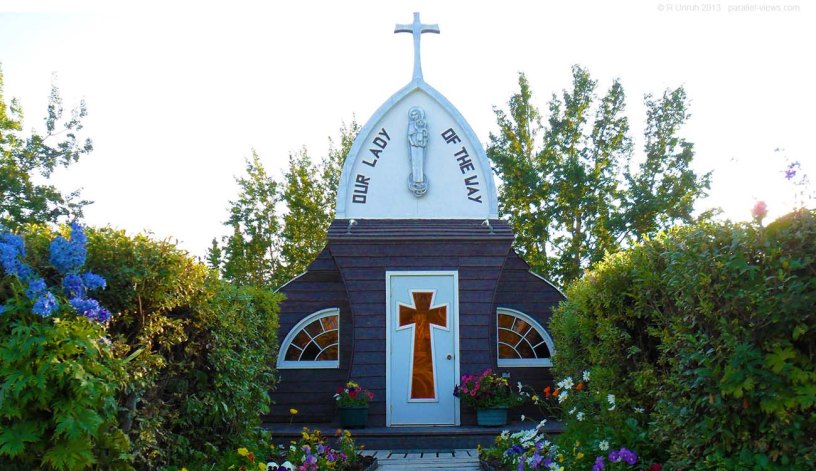 Our Lady of the Way church is located in Haines Junction, and was built out of whatever was available. Dating from… actually, I’ll let the sign in front of the church explain it.