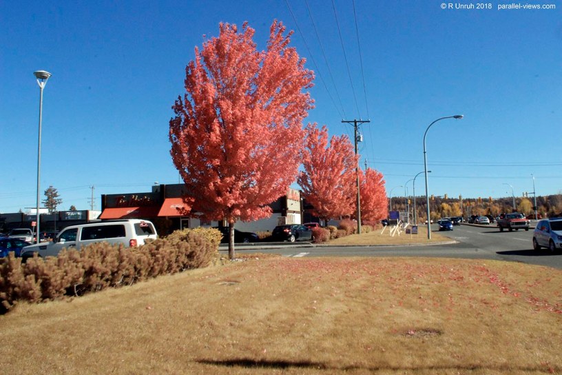 Except it isn’t- most of our leaves had fallen by the end of the first week in October; we had about two weeks of good colours in September, but the trees are bare now. That statement is wrong in another way, too: Northern BC doesn’t get too many red leaves in autumn. There are a few plants here and there, but most of our leaves only turn yellow.