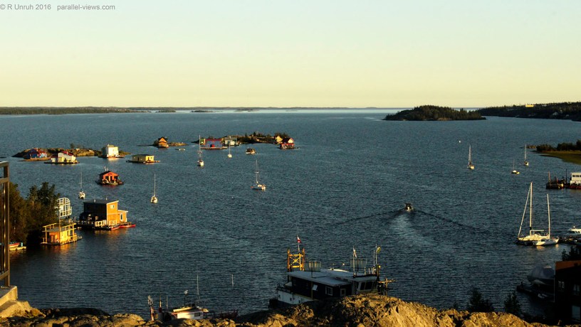 In another direction, the hill has an excellent view of the houseboats of Yellowknife- the sheltered arm here must protect them from the elements to some degree.
