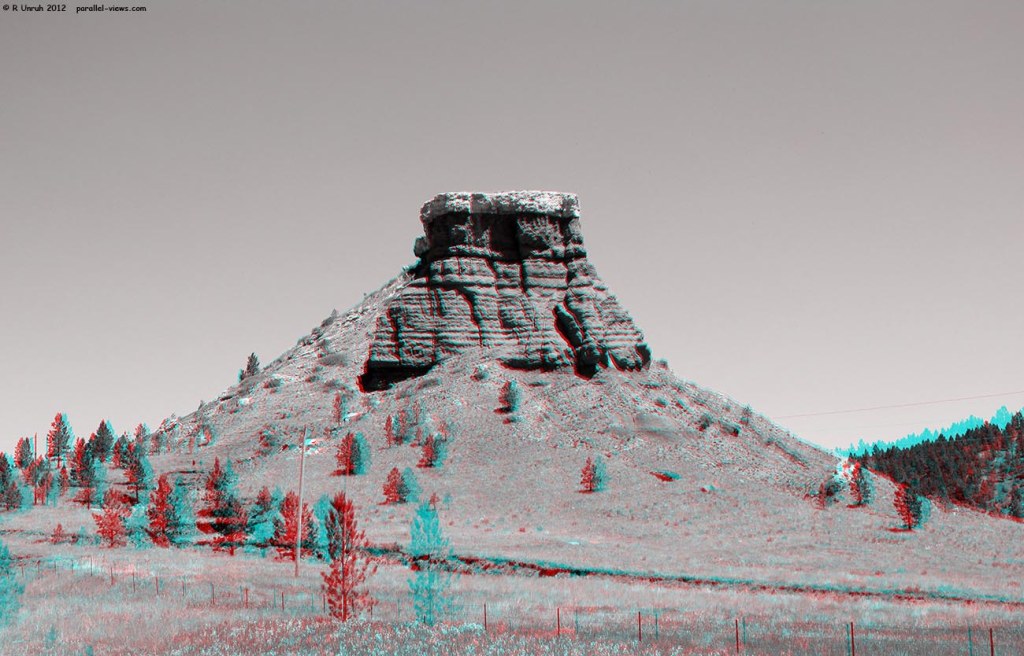 To me, this photo doesn’t work as 3D. The butte is too reddish, and the sky too cyanish(my spellchack says that isn’t a word, but if ‘greenish’ and ‘bluish’ are words, so is ‘cyanish’. My spellchack also says it should be called spellcheck, but if it’s wrong about cyanish, what else is it wrung about?). If the two colours weren’t placed right against one another, it might still work in the photo, but as it is, it is almost impossible to focus on the edges of the butte. They’re bright against a dark sky in one eye, and dark against a bright sky in the other.