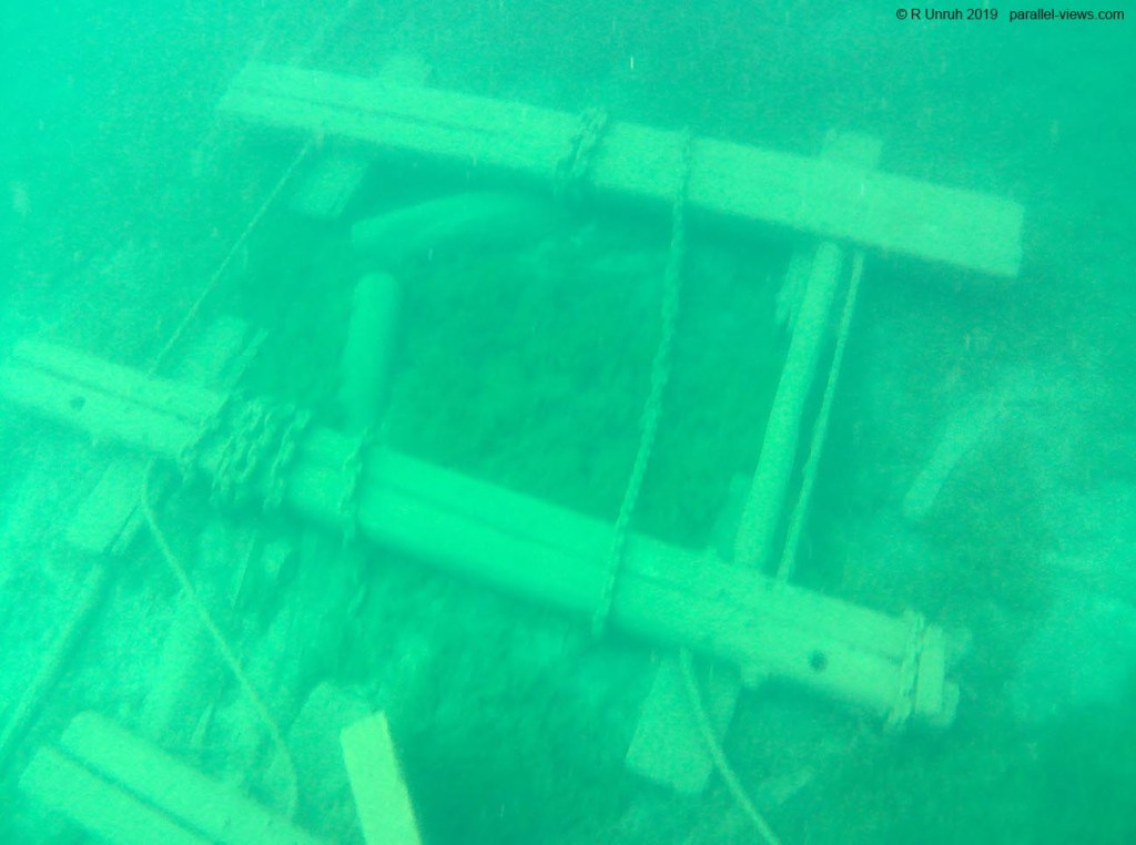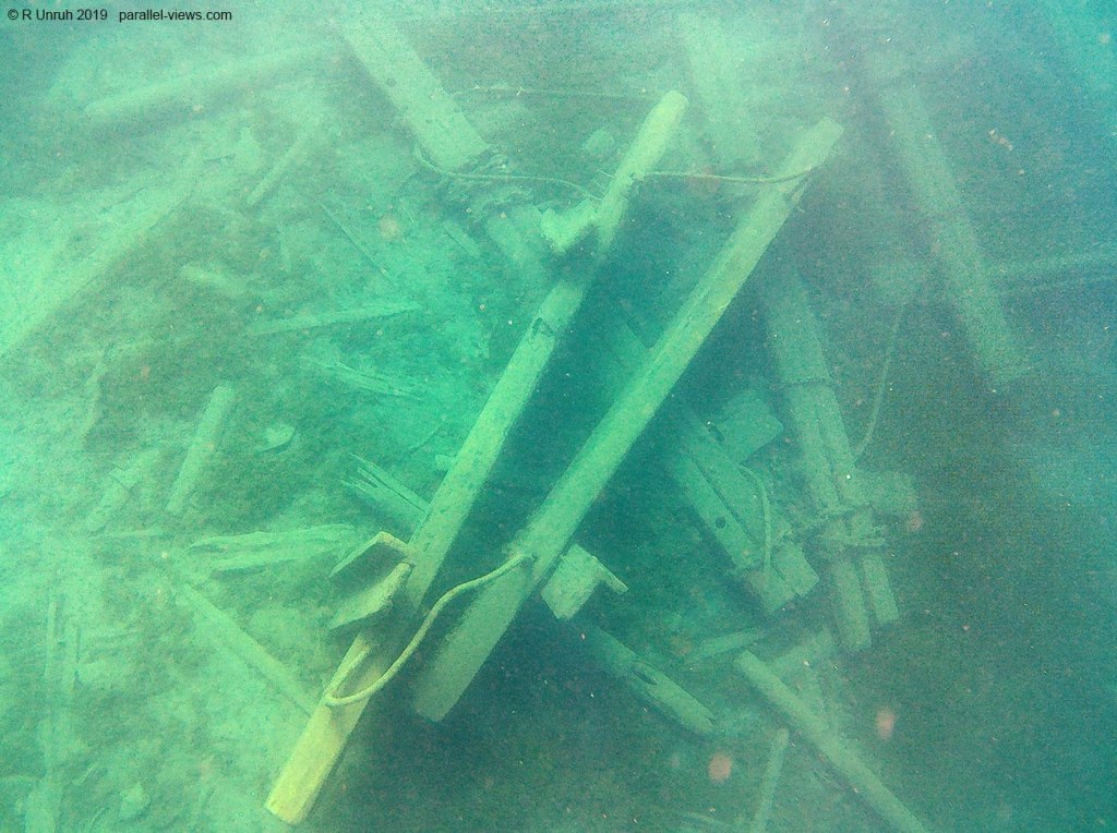 Anyhow, the Alice G sank in 1927 and the Bob Foote in 1902, so I didn’t lie about the ‘Century-old’ part. No one died in either wreck; Alice G was unmoored and ran aground during a wind storm, and Bob Foote was deliberately abandoned. They’re in shallow water; when the water levels were lower in other years, I could touch them and still have my hands above the surface. Even with the deeper water, I had the lung capacity to swim down, investigate, and take photos.