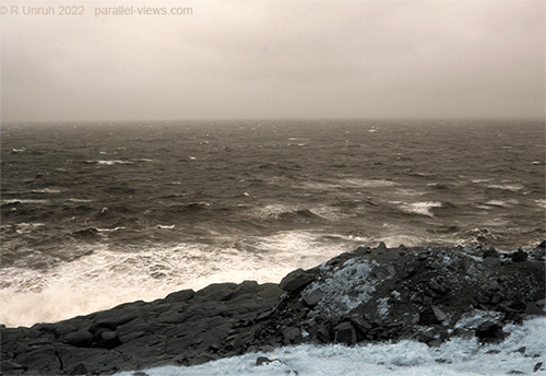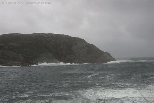 The one photo way above was looking from Fort Amherst to Cape Spear; this is the twin to that; Cape Spear looking to Fort Amherst. Again, it isn’t visible, just sheets of rain. My camera was having a hard time keeping the settings the same in the wind and rain here; even in the batch mode it was adjusting settings on the fly.