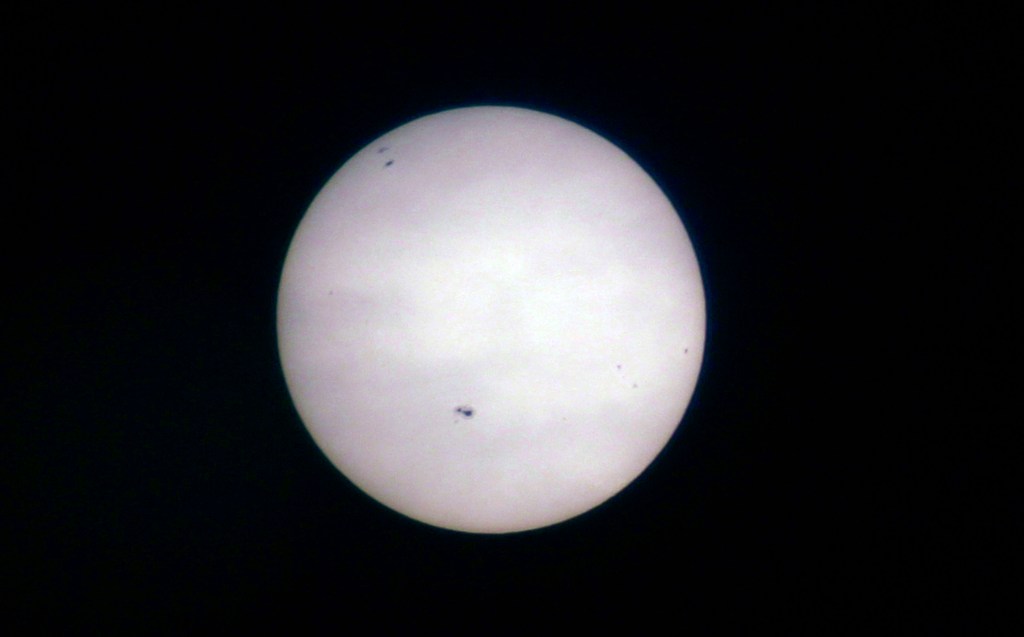 Barely. I had to boost the ISO way up(why it looks grainy), drop the exposure, and even then it was a 1/25 second long exposure. The longer exposures with reduced noise didn’t turn out, as it was windy and the camera was shuddering even on the tripod. The large sunspots are barely visible, but are there; they might have been clearer if it wasn’t so grainy. I might have even been able to see the small ones.