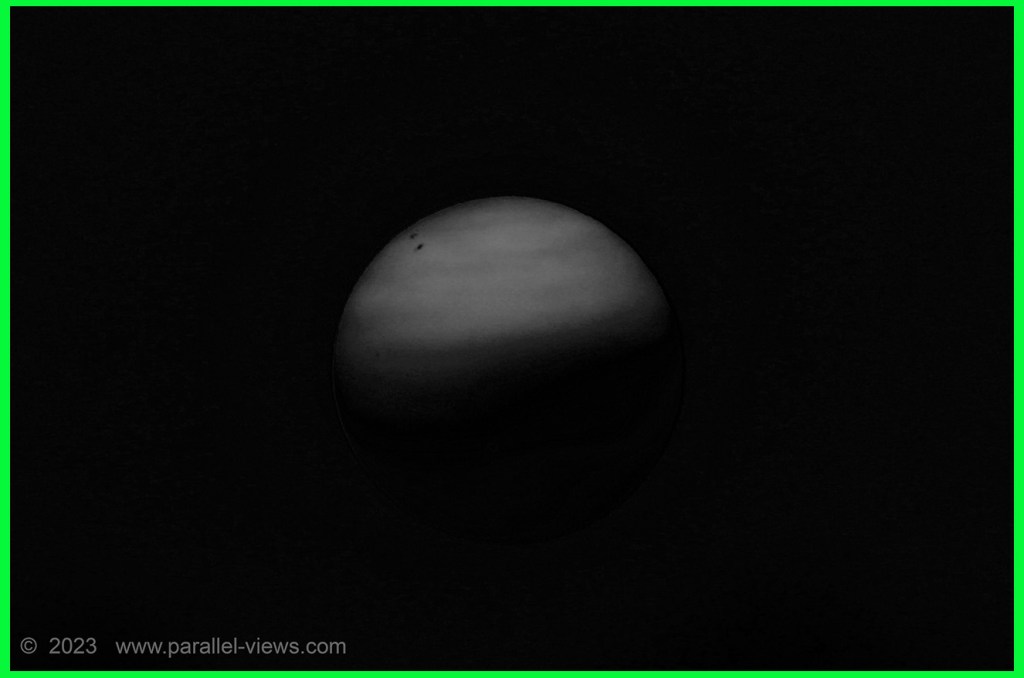 Last summer, we had a bad wildfire year(as opposed to 2022, where we had a bad wildfire year, or the bad wildfire year in 2021, not to be confused with the bad wildfire year in 2020… there might be a pattern if you’re a meteorologist, but I’m not seeing it). With the haze in the sky that day, I could look at the sun with the naked eye(well, except for my prescription eyeglasses, which I need to see anything). In fact, for the first time I can recall, I could see at a sunspot with the naked eye. There was a black speck in the bottom centre of the sun. I thought it might be a weather balloon, or aircraft, or UFO, but it moved with the sun. Of course I had to get a photo of it:
